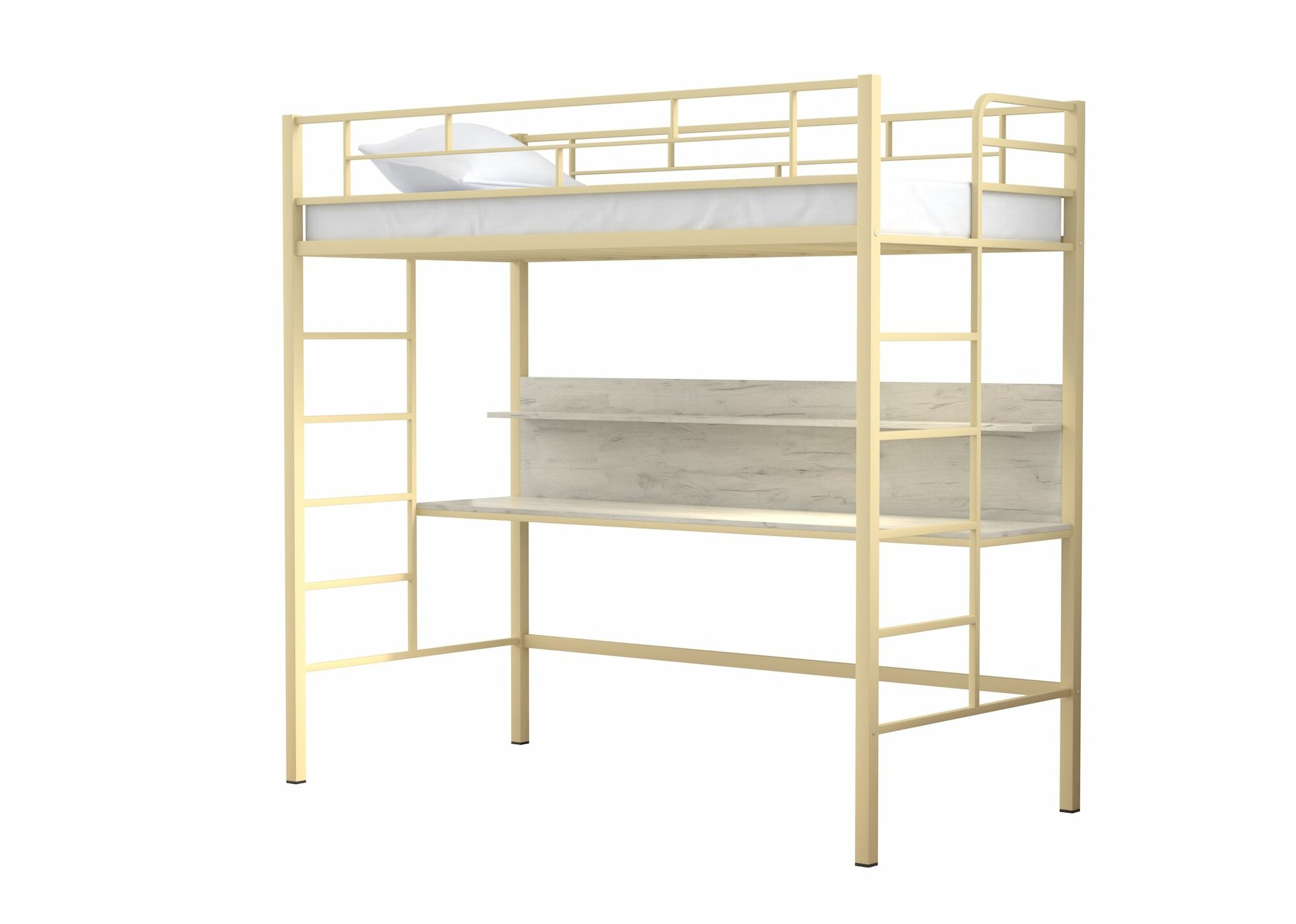 Кровать-чердак "Амстердам" Слоновая кость со столом Дуб молочный/ детская/ 90х190 см/ двухъярусная кровать с рабочей зоной/ для детей и взрослых/ железная/ металлическая/ двухэтажная/ взрослая