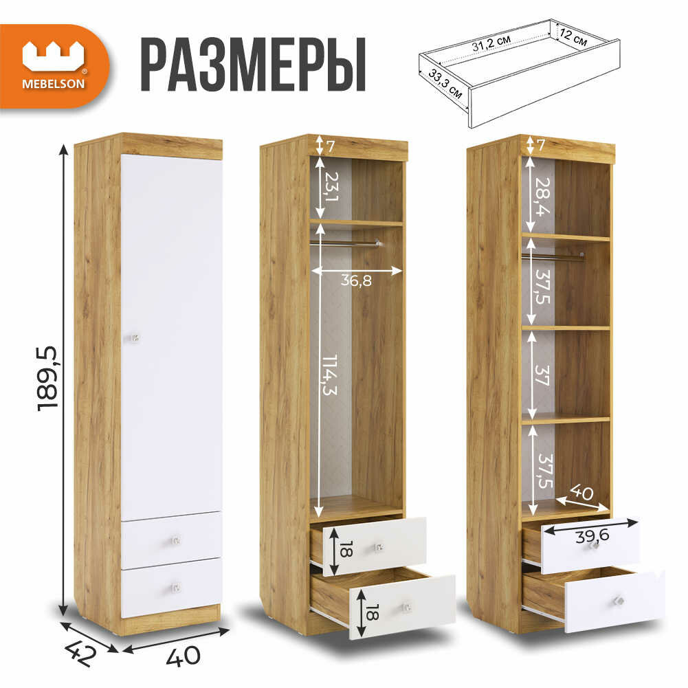 Шкаф однодверный (пенал) "Форсаж", распашной с ящиками, дуб крафт золотой/белый, 40*42*189,5 см., Mebelson 9 650 ₽