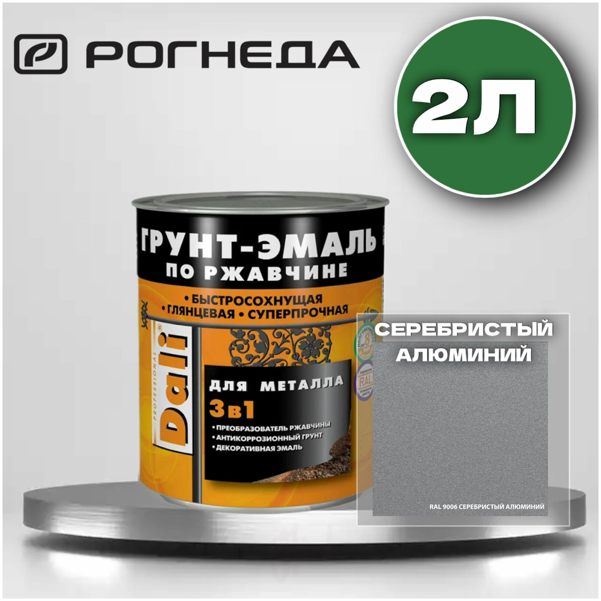 Dali Грунт-Эмаль по ржавчине 3в1 гладкая (Серебристый алюминий, RAL 9006, 2 л)