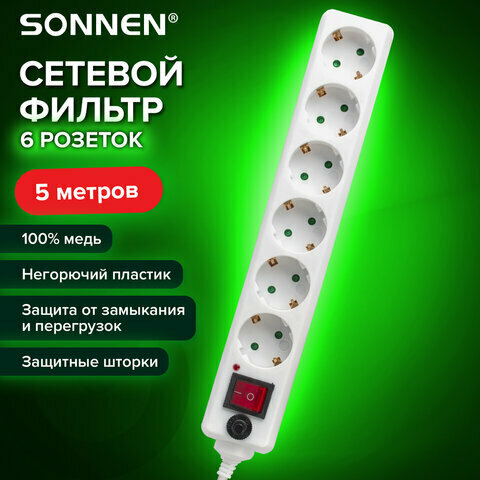 Сетевой фильтр SONNEN U-365, 6 розеток, с заземлением, выключатель, защита от перегрузок, 10 А, 5 м