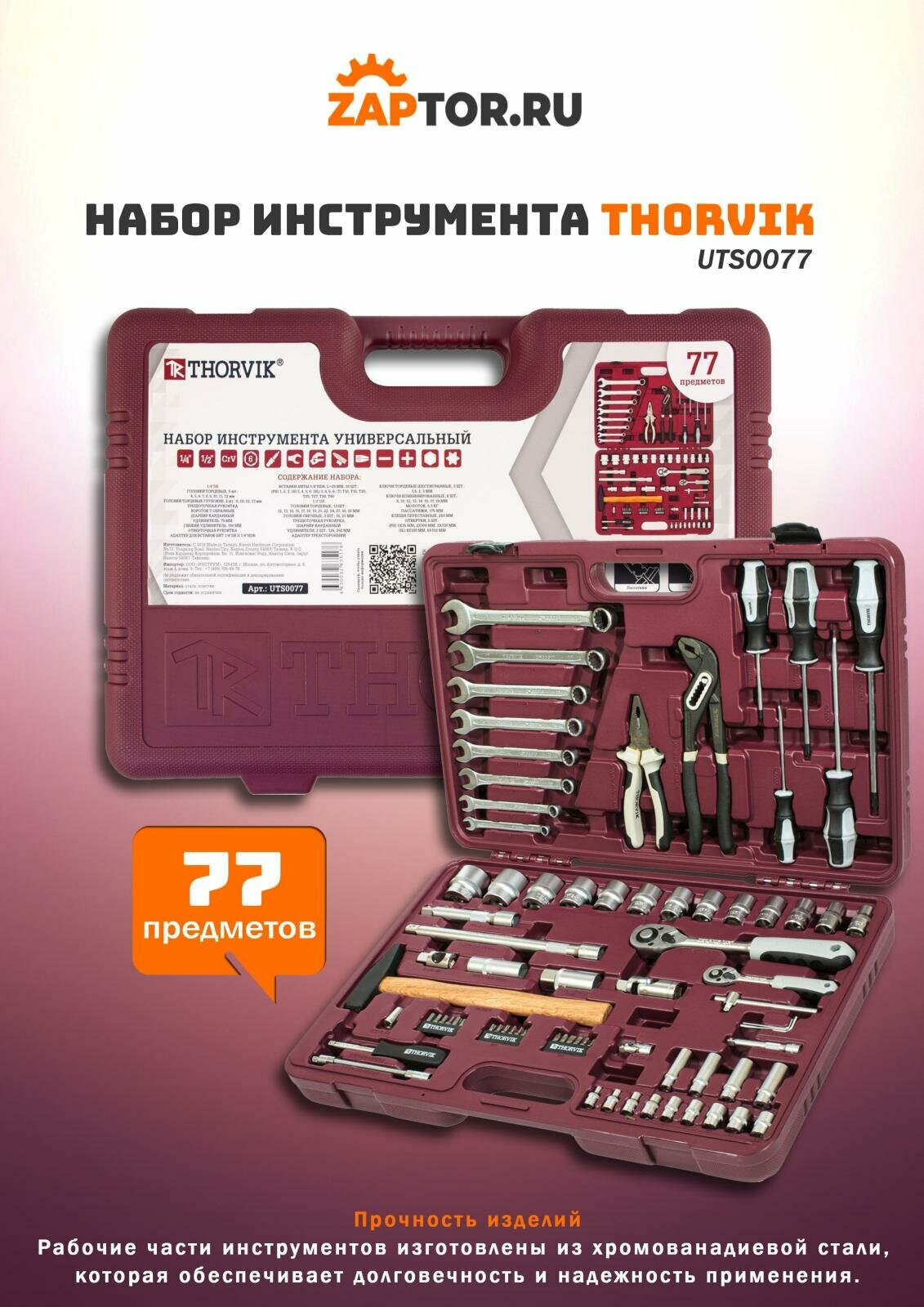 Набор инструмента универсальный 1/4, 1/2"dr, 77 предметов", thorvik, uts0077