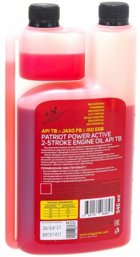 Масло для 2-тактных двигателей PATRIOT Power Active 2T 0,946 л с дозатором, бут