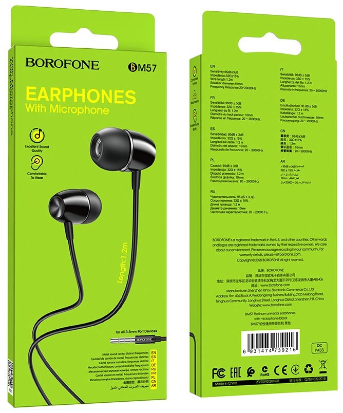Проводные наушники BOROFONE BM57 Platinum, Jack 3.5mm, 1.2 м, черный, контроллер с микрофоном