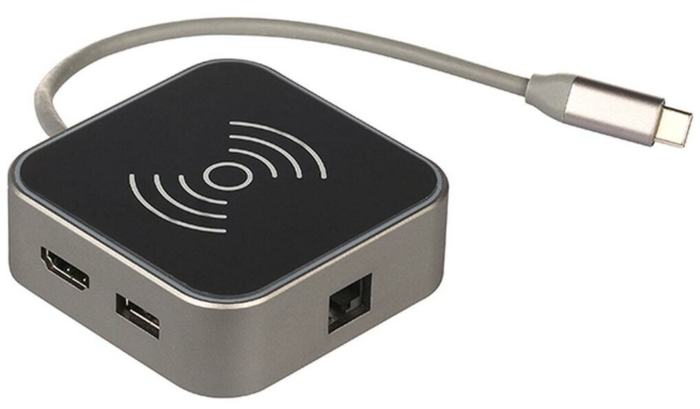 USB-Хаб3-port Type-C Hub Qumo HB-0003 (USB 3.0 F x 2 / USB 2.0 /HDMI 19F / RJ45 F / Qi) Серый