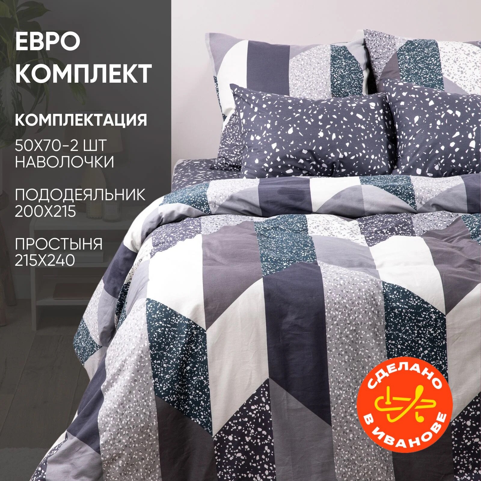Постельное бельё Евро Ночь Нежна Флорида 200х215 см, 240х215 см, 70х70 см 2шт, поплин, 110гр, хл 100%, цвет серый