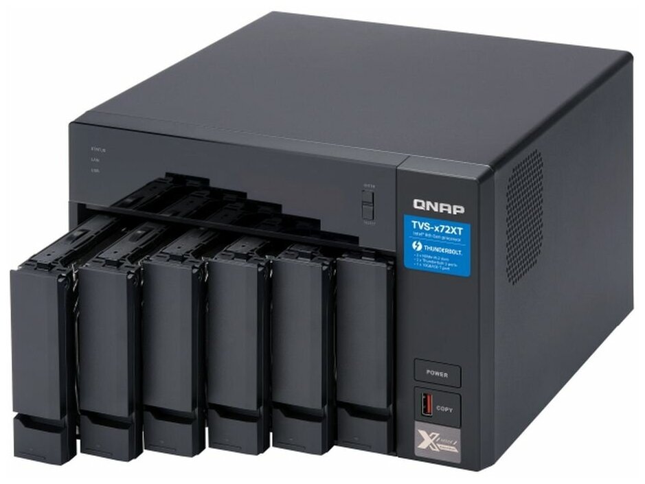 SMB QNAP TVS-672XT-i3-8G 6-Bay NAS, Intel Core i3-8100T 4-core 3.1 GHz Processor, 8GB DDR4 RAM (max 32GB RAM), 6x 2.5"/3.5" SATA HDD/SSD + 2x M.2 PCIe SSD slot, 2xGbE LAN, 1 x 10GBase-T, 2 x Thunderbolt 3 port 471 039 ₽