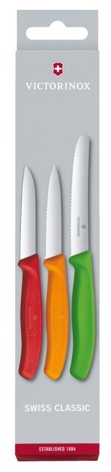 Набор из 3 ножей для чистки и нарезки овощей VICTORINOX: красный нож 8 см, оранжевый нож 8 см, зелёный нож 11 см