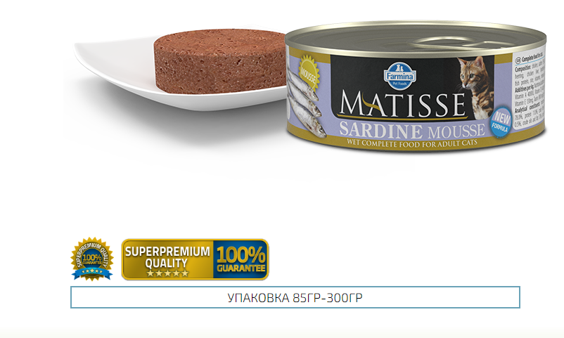 Мы выбрали 10 лучших цен на Farmina MATISSE Sardine Mousse мусс для взрослых кошек с сардинами 300 г. Перед тем как купить Farmina MATISSE Sardine Mousse мусс для взрослых кошек с сардинами 300 г посмотрите найденные предложения из Яндекс Маркета и других сайтов на основе XML фидов.