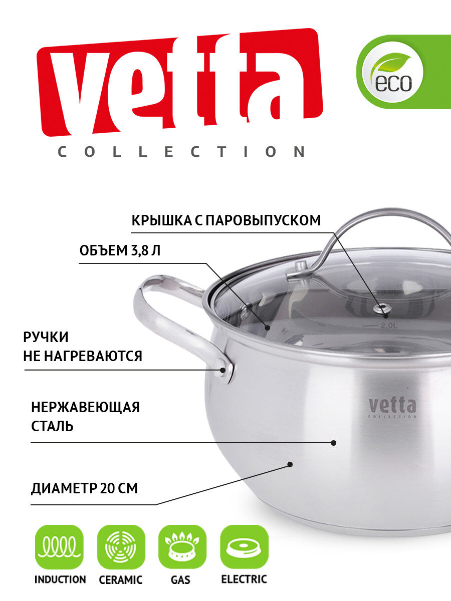 Vetta Женева Кастрюля 20х11,5см. 3,8л. со стекл. крышкой, индукция 822-084 2 910 ₽