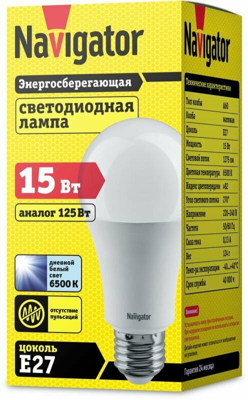 Лампа светодиодная Navigator NLL-A 61200/61239/71365 , E27, A60, 15 Вт, 6500 К