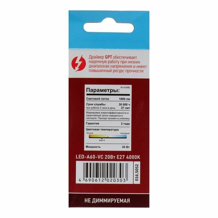 Лампа светодиодная IN HOME LED-A60-VC, Е27, 20 Вт, 230 В, 4000 К, 1900 Лм (комплект из 9 шт) информация: