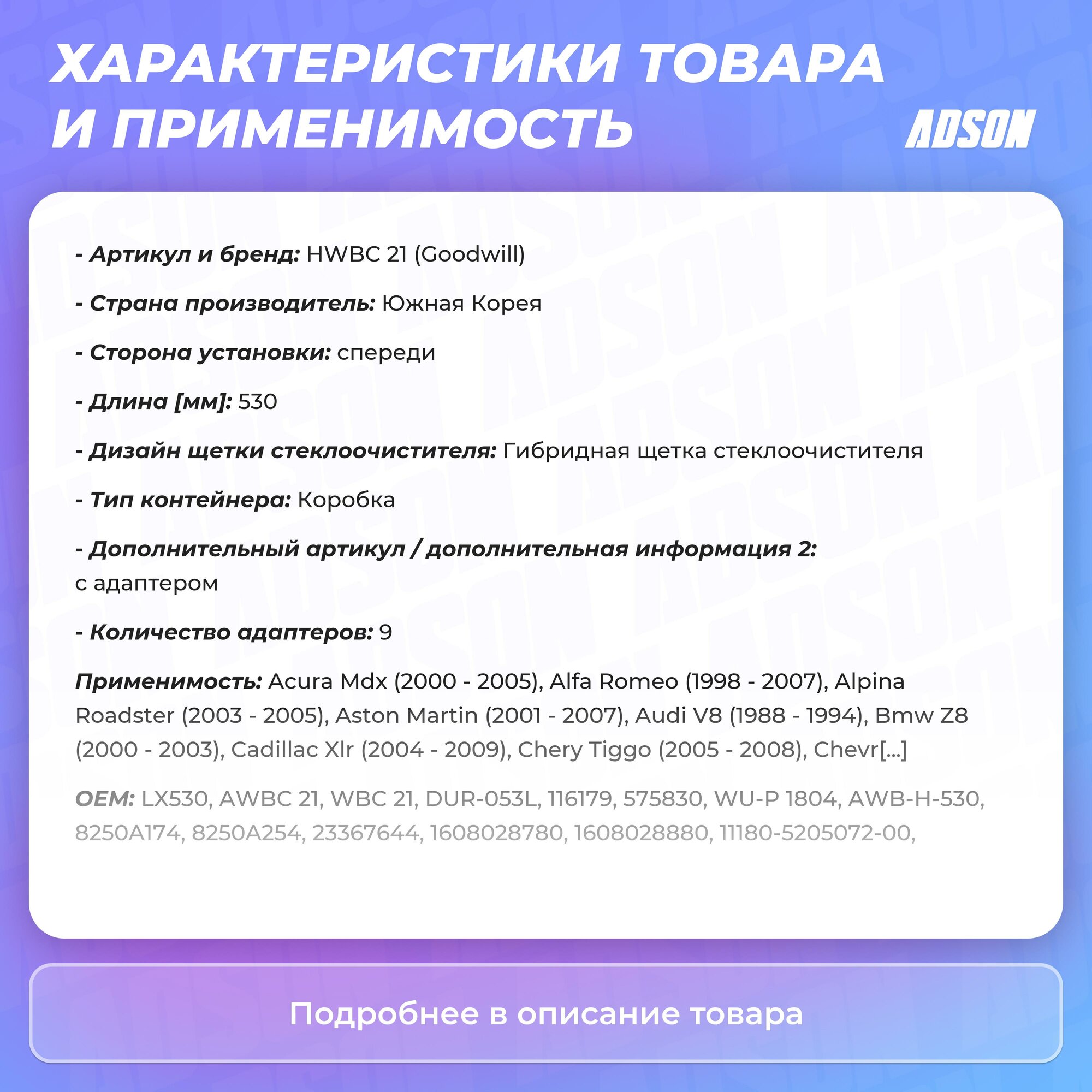 GOODWILL HWBC 21 Щетка стеклоочистителя 530 мм гибридная 1 шт GOODWILL Multi-adapters hybrid wiper blade HWBC 21 1 888 ₽