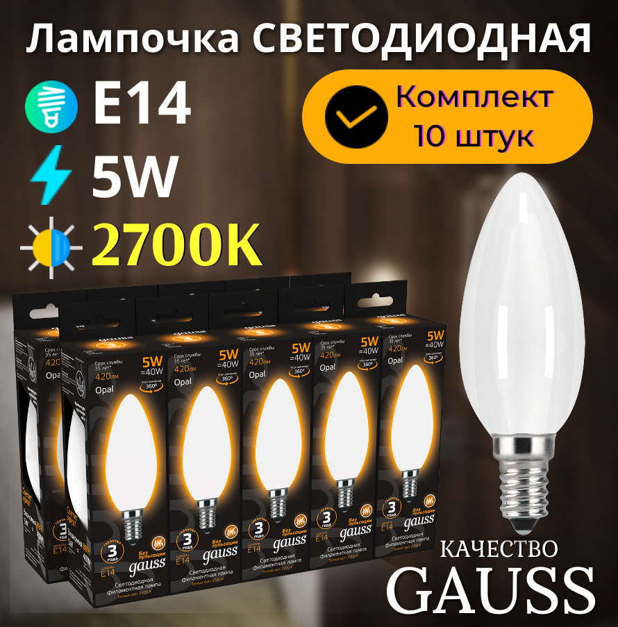 Отзывы на Лампочка светодиодная E14 Свеча 5W теплый свет 2700К упаковка 10 штук Gauss Filament