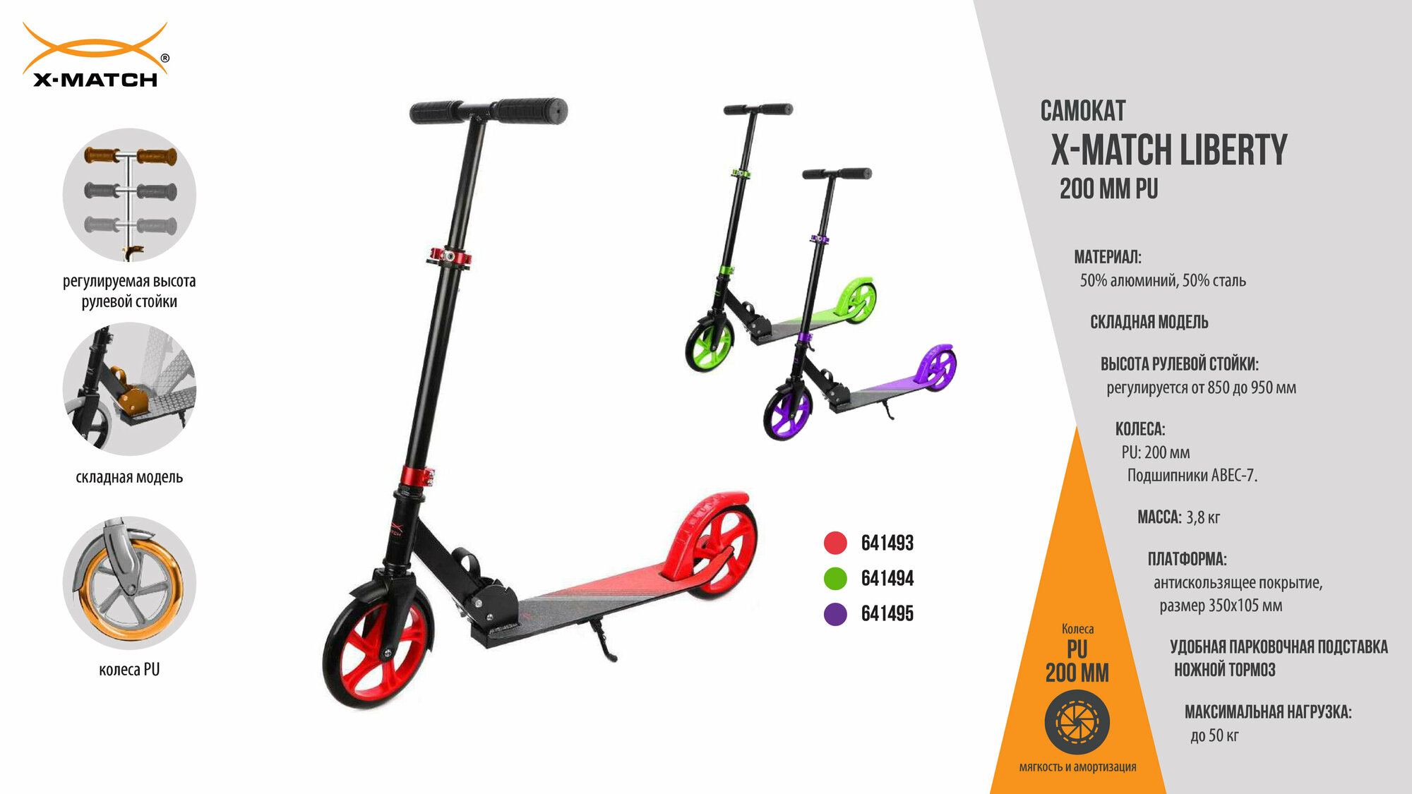 Самокат X-Match Liberty, 200 мм PU, красный (641493)