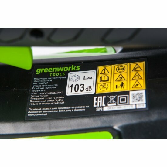 Воздуходув аккумуляторный Greenworks Арт. 2405607, 60V, бесщеточный, без АКБ и ЗУ информация: