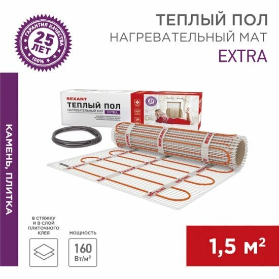 Теплый пол (нагревательный мат) Rexant Extra (1.5 кв. м, 0.5х3.0 м, 240 Вт) информация: