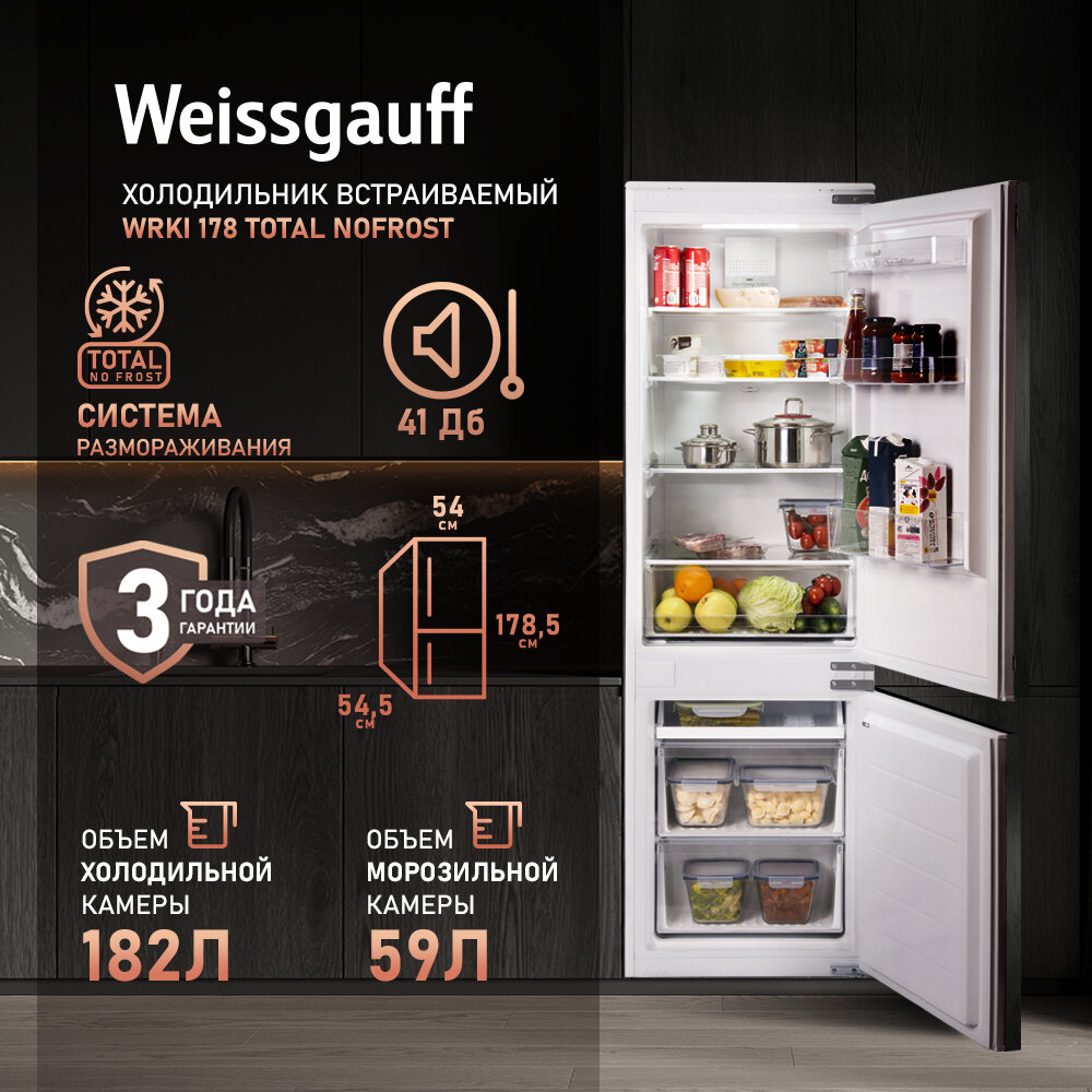 10 цен на Встраиваемый холодильник Weissgauff Wrki 178 Total NoFrost двухкамерный, 3 года гарантии, объем 241 л, технология тихой работы Super Silent, электронное управление, бутылочница, LED-освещение, полки из закаленного стекла, А+