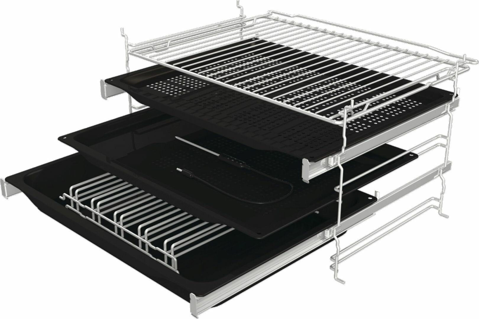| Подробная комплектация | глубокий эмалированный противень, мелкий эмалированный противень, 1 перфорированный эмалированный противень, решетка, термозонд для мяса, частично выдвижные телескопические направляющие на 2-х уровнях, резервуар для воды: 0.13 л |