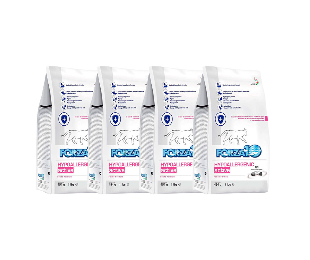 10 цен на FORZA10 Hypoallergenic Active сухой корм для взрослых кошек с проблемами пищевой непереносимости и аллергии с рыбой 0,454 кг х 4 шт.