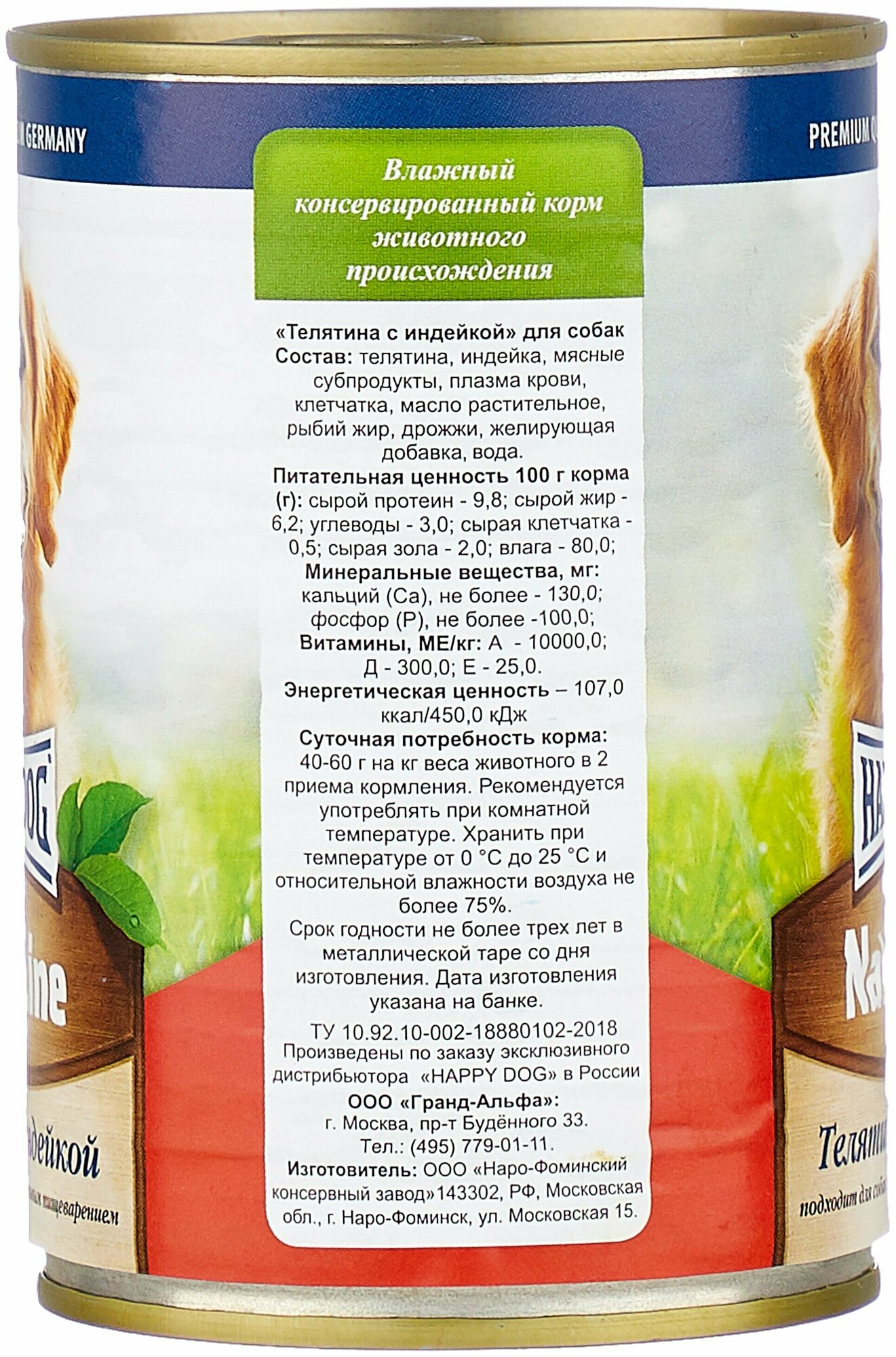 Влажный корм Happy Dog Natur Line для собак любых пород телятина с индейкой (12шт х 410гр) информация: