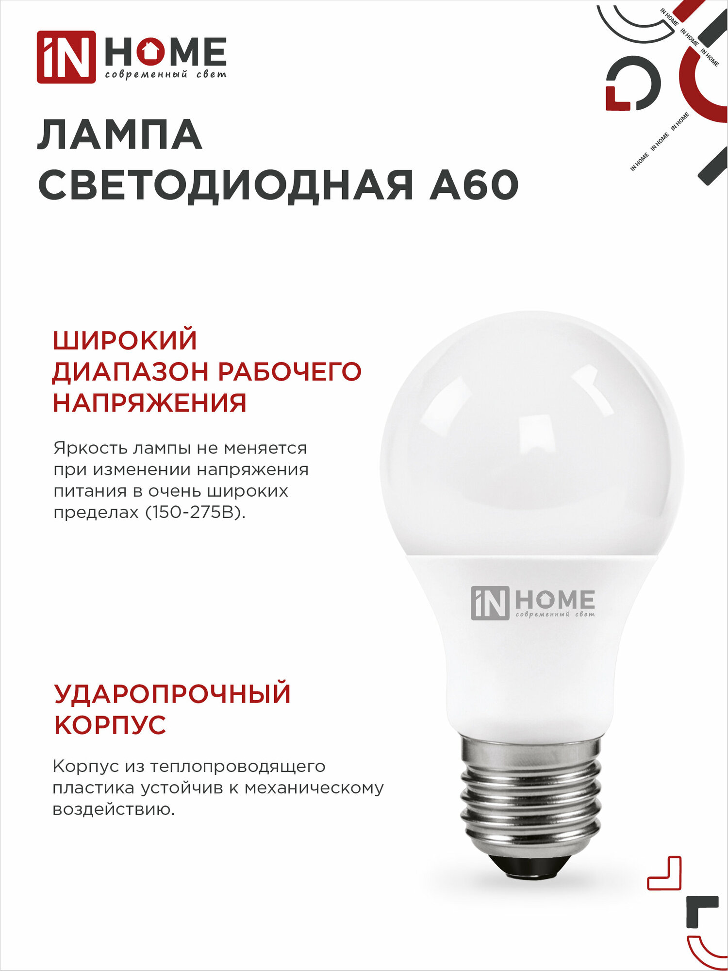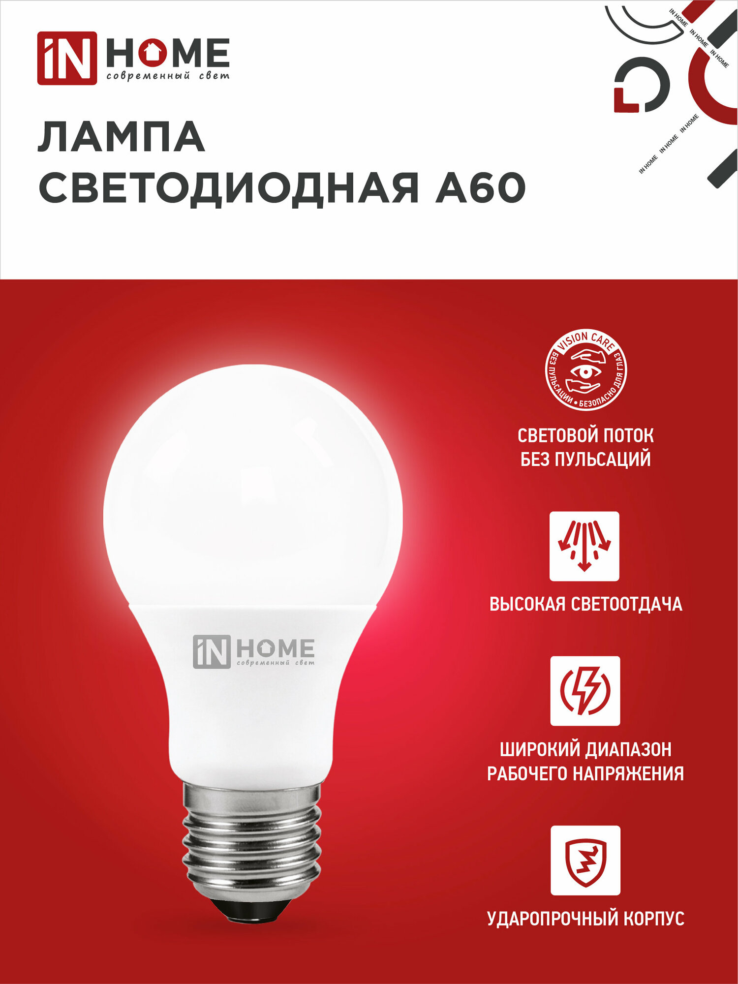 Лампа светодиодная IN HOME LED-A60-VC, Е27, 20 Вт, 230 В, 6500 К, 1900 Лм