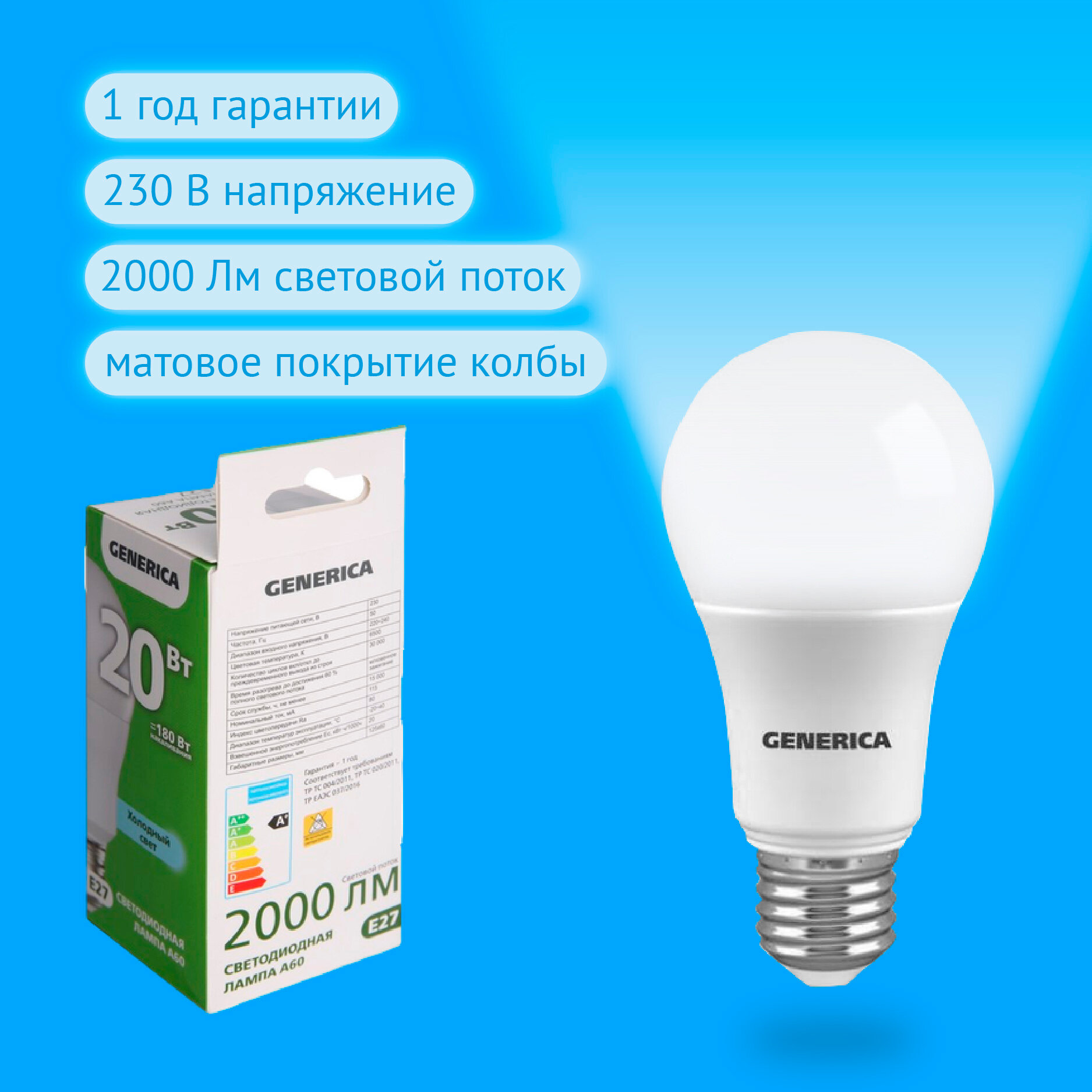 (20 шт.) Светодиодная лампочка GENERICA LED A60 груша, мощность 20 Вт, напряжение питания 220 В, цветовая температура 6500 К, холодный белый свет, цоколь E27, размер 60х125 мм 2 800 ₽