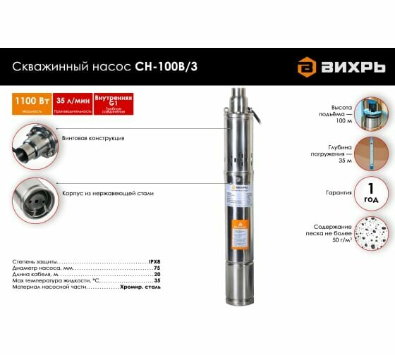 Отзывы на Насос / Скважинный насос Вихрь СН-100B/3 (1100 Вт, высота подъема – 100 м, 35 л/мин, 1”, глубина погружения в воду до 35 м, 75 мм)