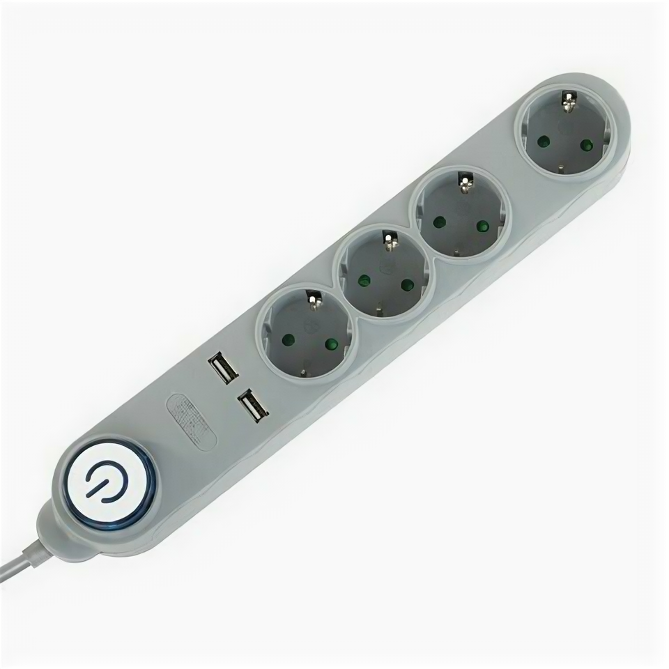 Сетевой фильтр SONNEN DX04, 4 розетки, 2 USB-порта, с заземлением, 10 А, 1,5 м, серый, 513493