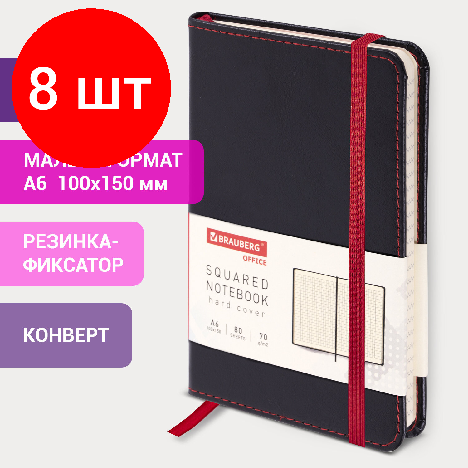 10 цен на Комплект 8 шт, Блокнот малый формат 100x150мм А6, BRAUBERG Office, под кожу, 80л, клетка, черный, 113325