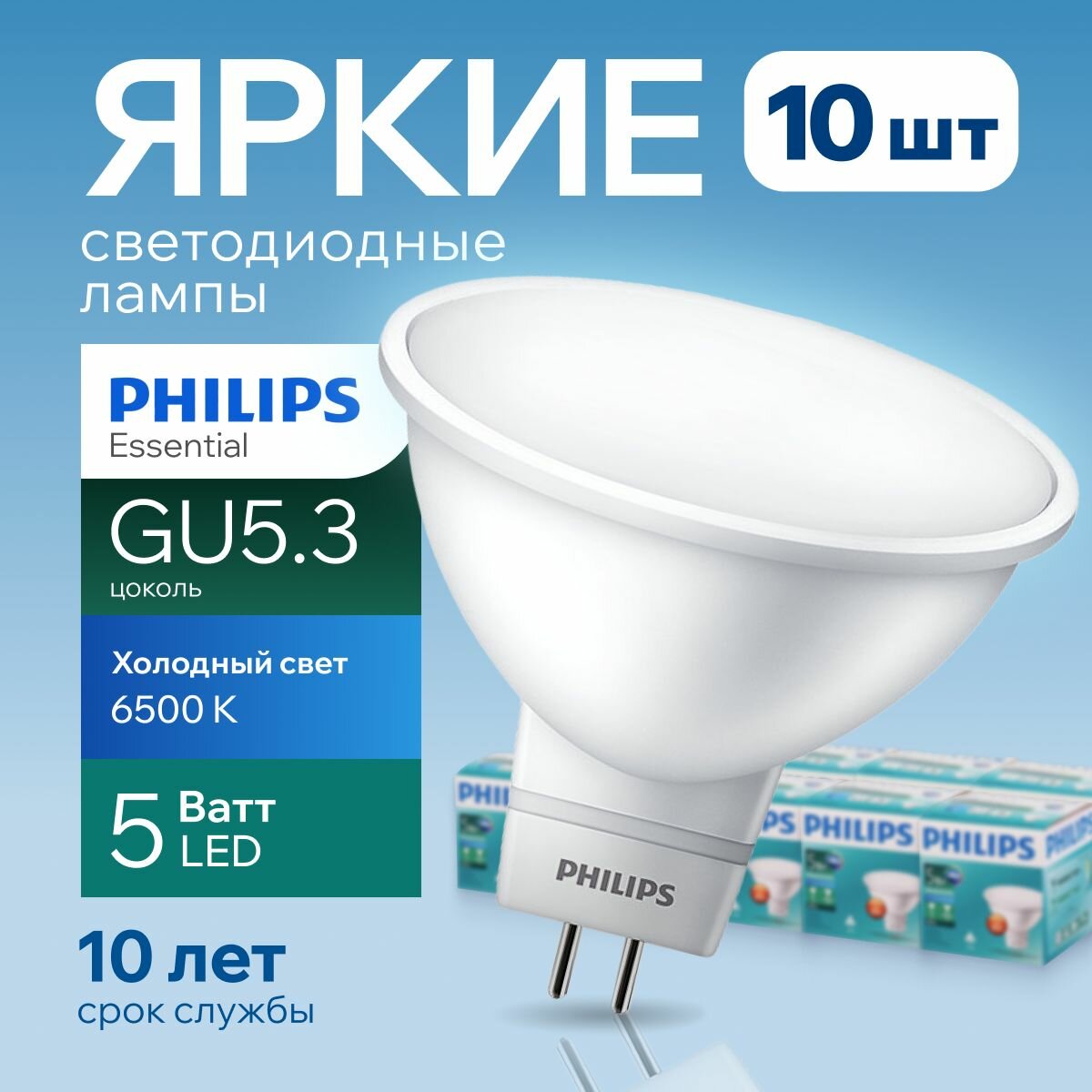 10 цен на Лампа Светодиодная Софит 5W 220V GU5.3 MR16 400Лм D-51mm L-49mm 6500К Свет Холодный белый Philips, уп. 10шт