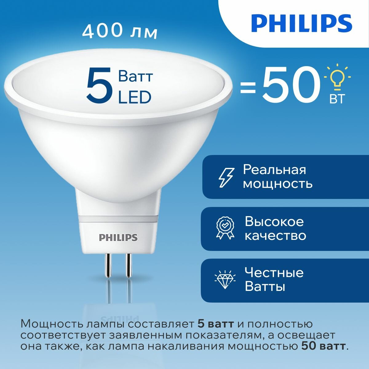 Отзывы на Лампа Светодиодная Софит 5W 220V GU5.3 MR16 400Лм D-51mm L-49mm 6500К Свет Холодный белый Philips, уп. 10шт