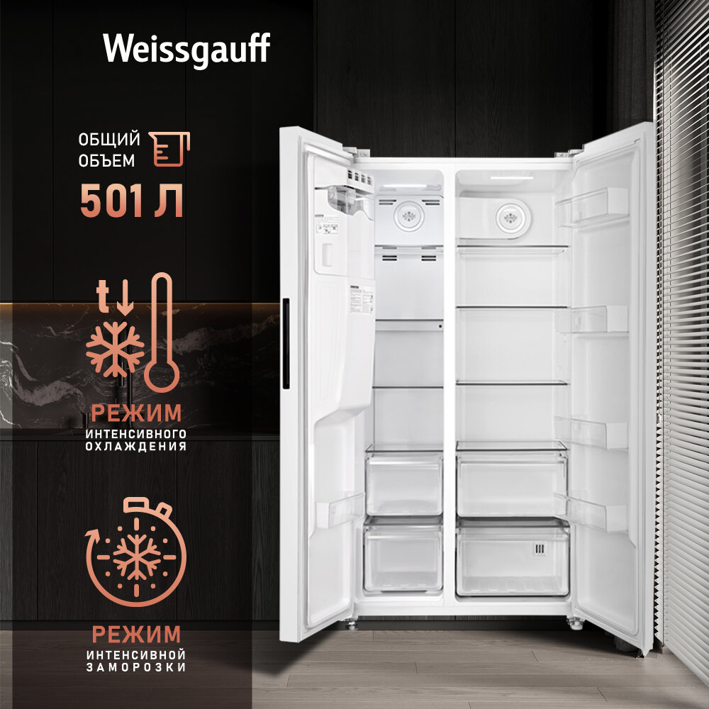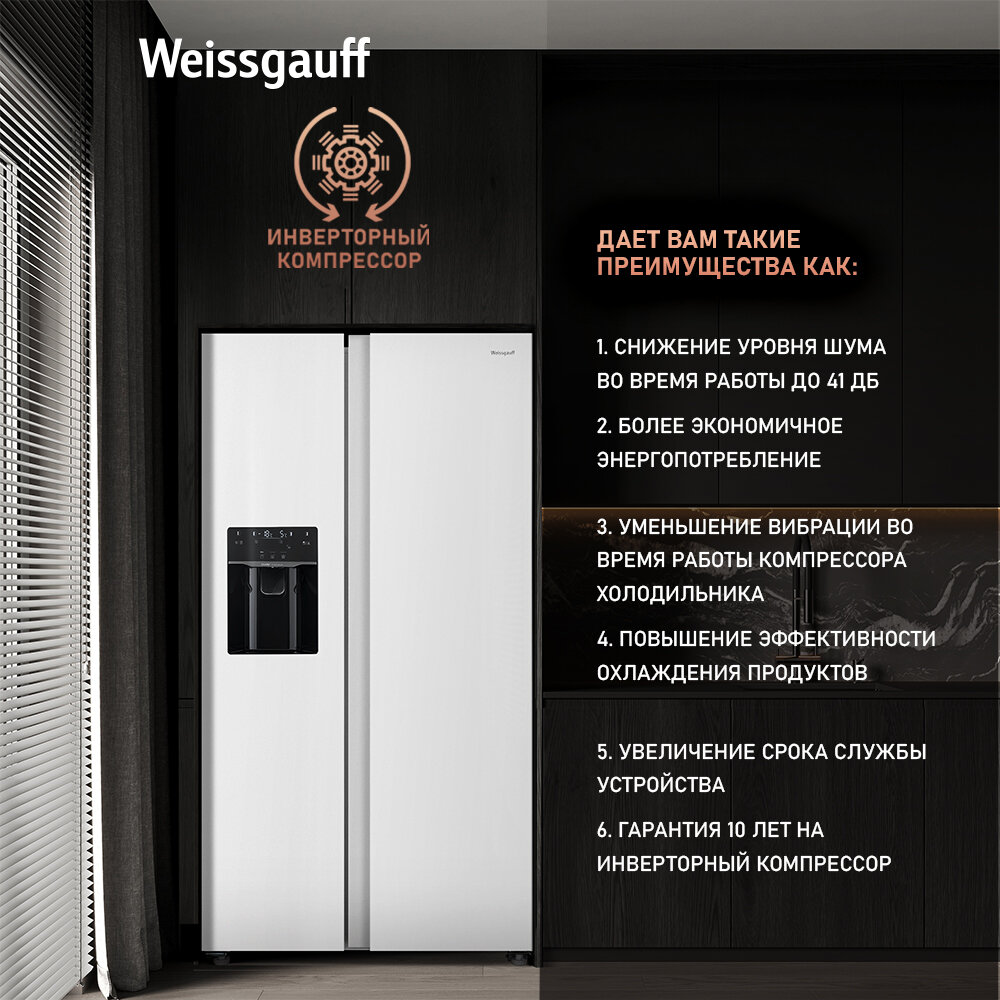 10 цен на Отдельностоящий холодильник с инвертором и генератором льда Weissgauff Wsbs 692 NFW Inverter Ice Maker Side by Side двухдверный, 3 года гарантии, Объём 547 л, Генератор льда, Подача питьевой воды, Сенсорное управление, Суперзаморозка, Суперохлаждение, А+