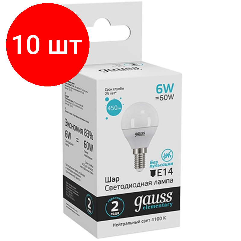 Лампочка светодиодная E14 Шар 6W нейтр-белый свет 4100K 450lm упаковка 10 штук Gauss Elementary