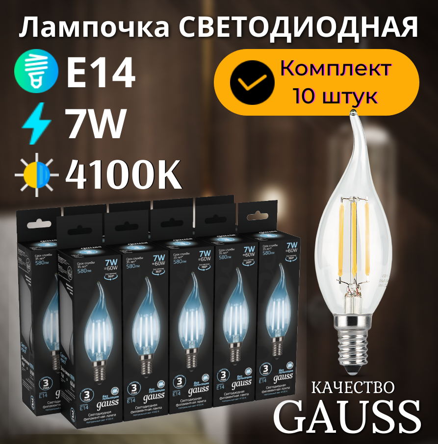 Отзывы на Лампочка светодиодная E14 Свеча на ветру 7W нейтр белый свет 4100К упаковка 10 шт. Gauss Filament
