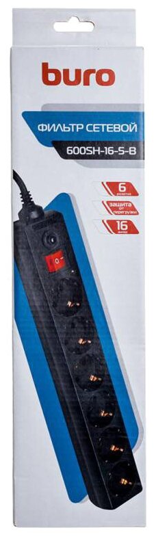 BURO Сетевой фильтр, 6 розеток, 5 метров, (600SH-16-5-B), черный (коробка) {475279} 965 ₽