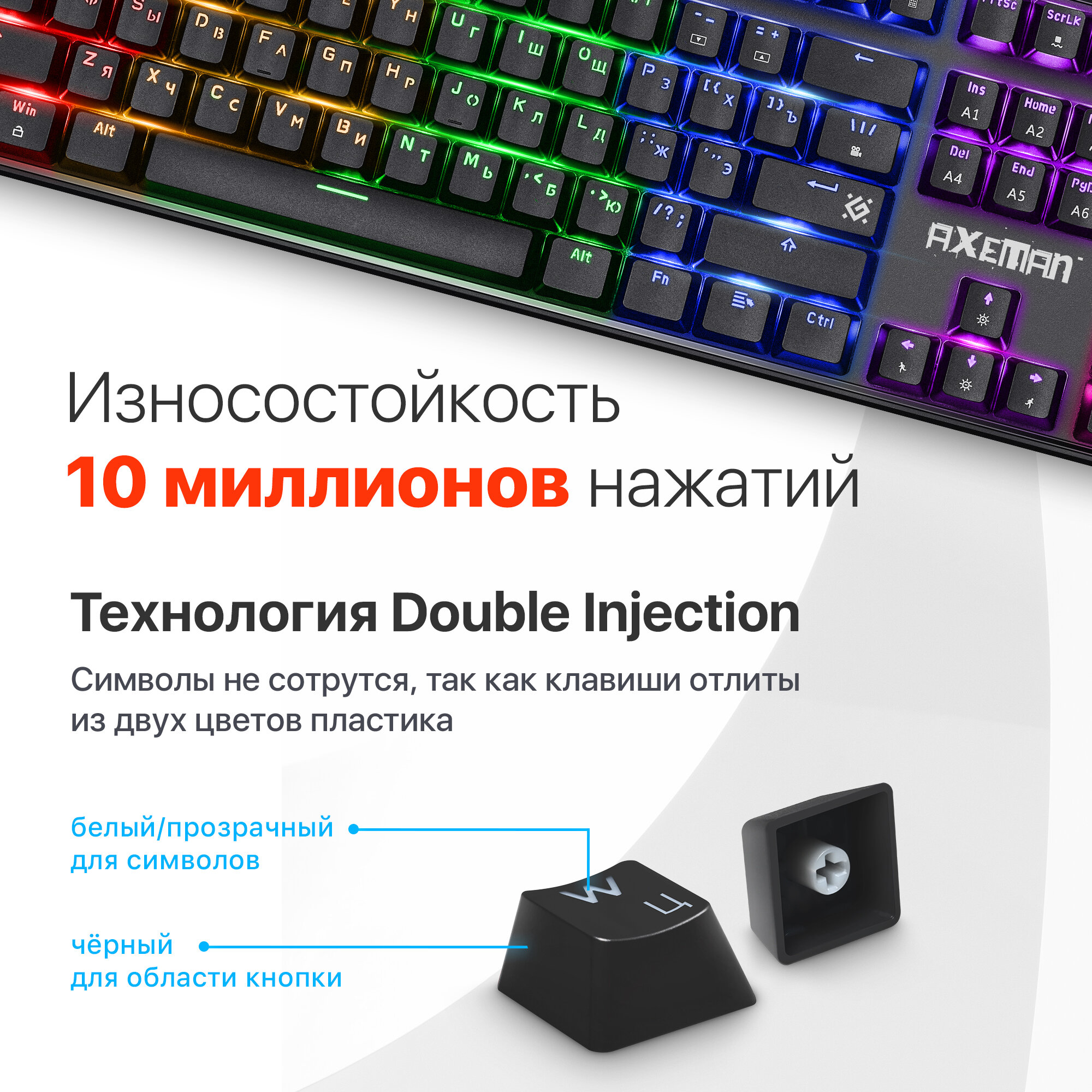 | Дополнительная информация | регулируемая подсветка символов и клавиш, технология Double injection, функция anti-ghost, ресурс до 10 миллионов нажатий, аппаратная блокировка клавиши WIN во время игры |