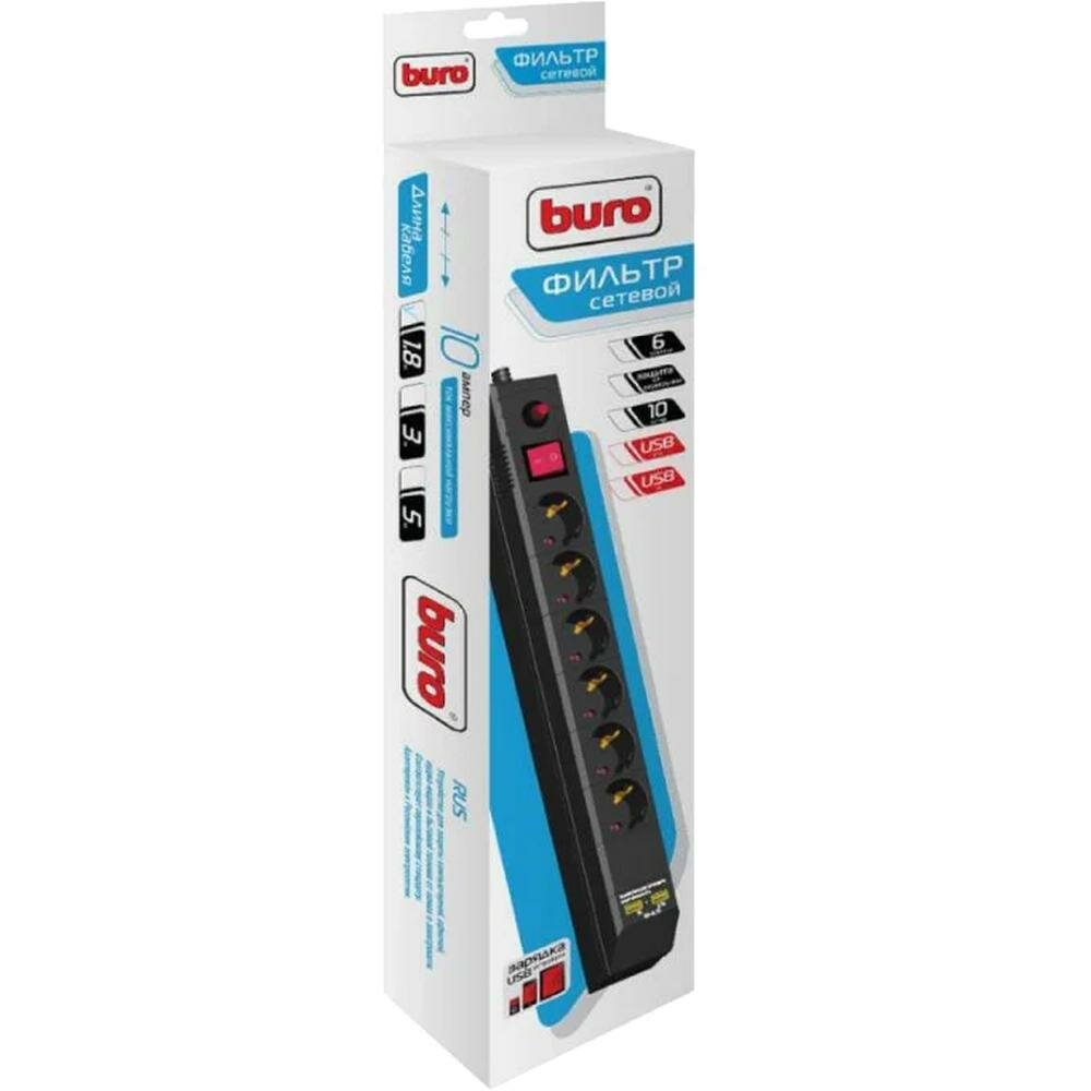 Сетевой фильтр BURO BU-SP1.8_USB_2A 6 розеток 1.8м черный 2USB информация: