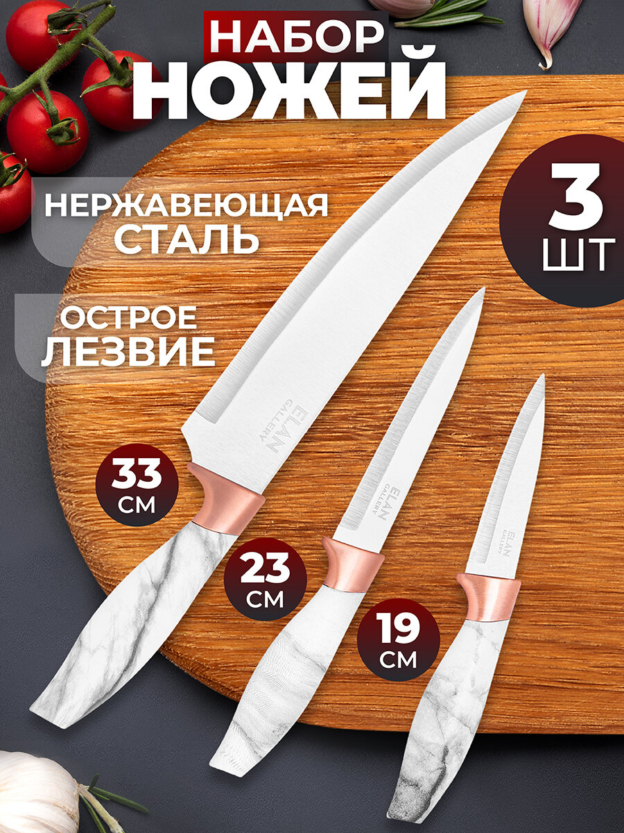 10 цен на Набор 3-х ножей Elan Gallery Мрамор с бронзой 19,5х2х2,8 см, 23х2х2,8 см, 33х2,5х4,6 см (240199)