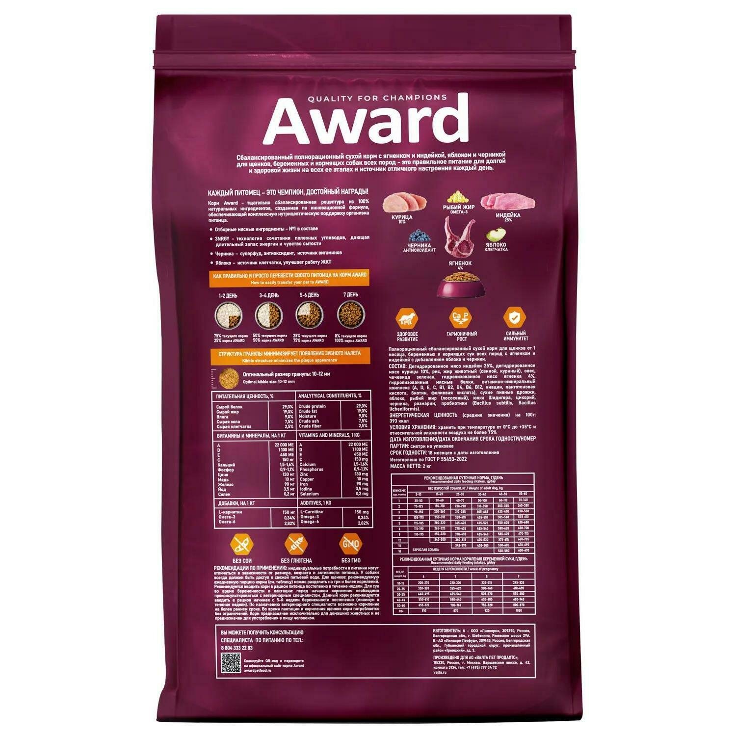AWARD сухой корм для щенков всех пород от 1 месяца, беременных и кормящих сук, с ягненком, индейкой, яблоком и черникой - 800 г информация: