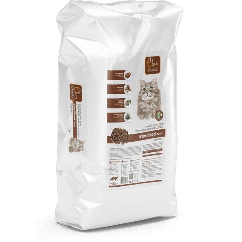 CLAN CLASSIC STERILIZED 30/14 для взрослых кастрированных котов и стерилизованных кошек с индейкой (10 кг)