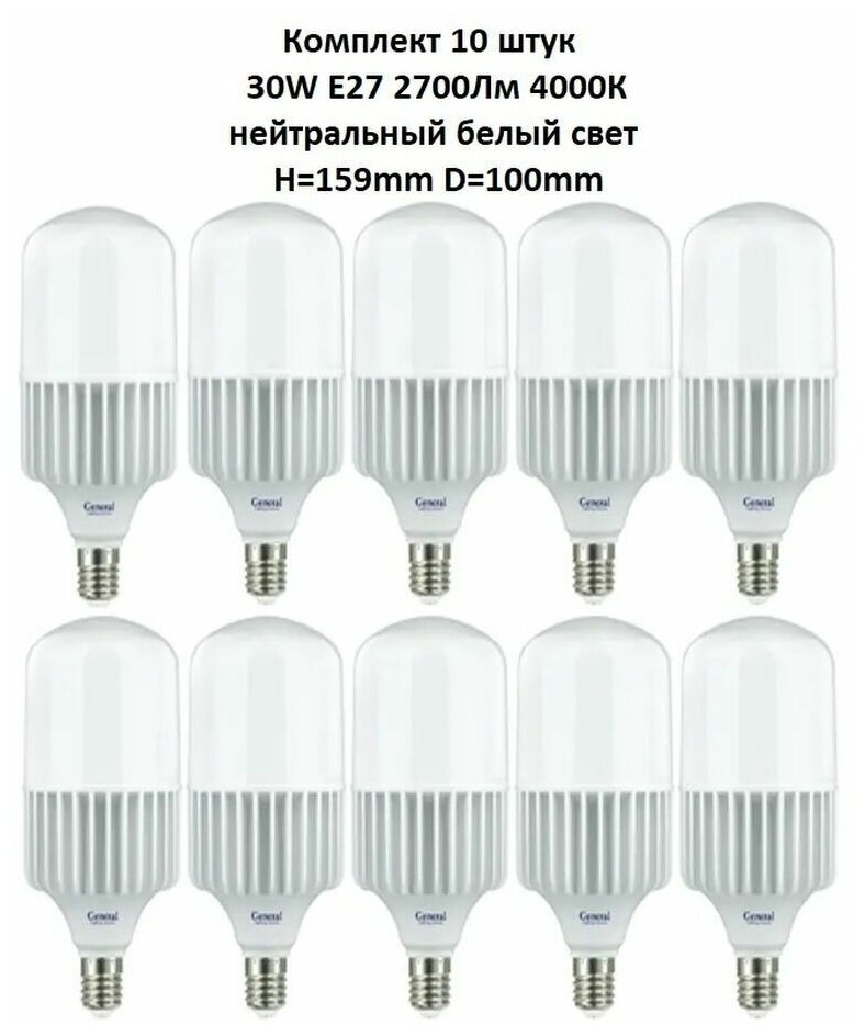 General, Лампа светодиодная, Комплект из 10 шт., 30 Вт, Цоколь E27, 4000К, Форма лампы Бочонок информация: