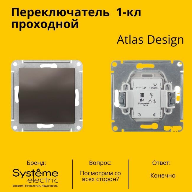 Отзывы на Переключатель проходной Systeme Electric Atlas Design 1-клавишный, 10А, 10 AX, Мокко - 2 шт.