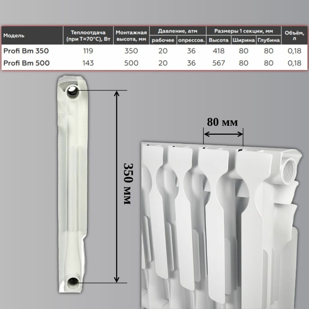 10 цен на Радиатор секционный биметаллический Profi BM 350 6 секций параметры 418х480х80 боковое подключение Сантехническая нить 20 м