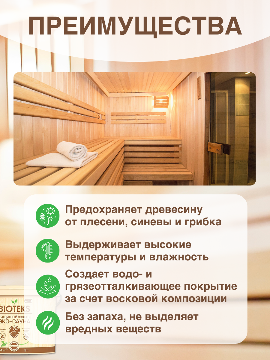 Текс BIOTEKS эко-сауна защитный состав термостойкий, водорастворимый, полуматовый (2л) информация: