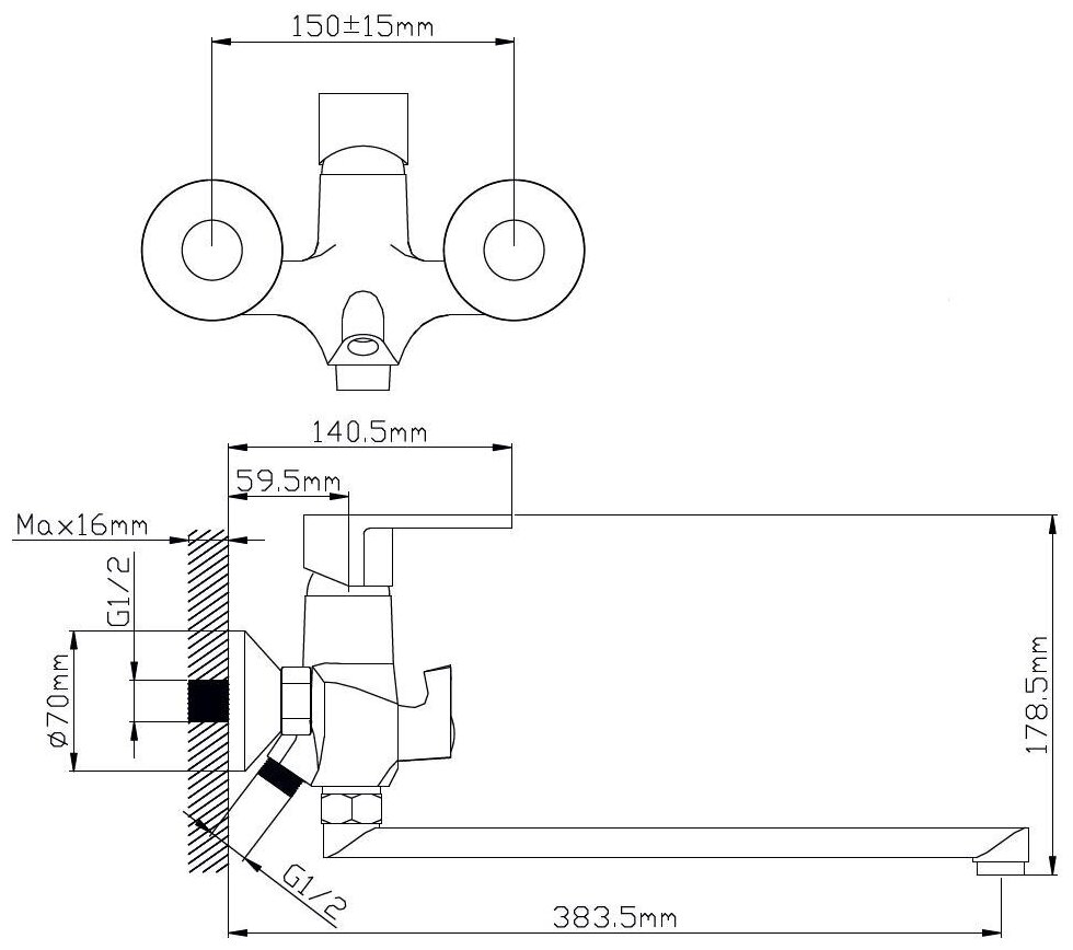 Смеситель на раковину настенный Эверест B46-350 с круглым поворотным изливом, кран-буксы 1/2", хром