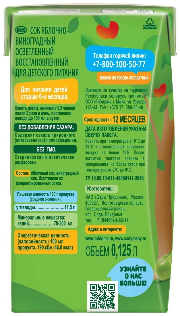 Сок сады придонья Яблоко, виноград, с 6 месяцев, 125мл информация: