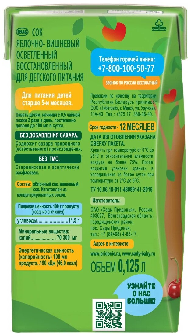 Сок сады придонья Яблоко, вишня, с 5 месяцев, 125мл информация: