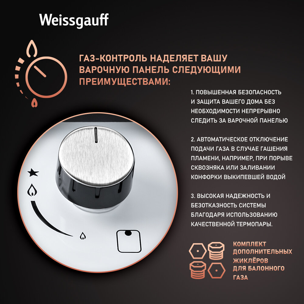 Варочная панель Weissgauff HGG 640 BGBV, Рукоятки Hi-Tech, Автоматический электроподжиг