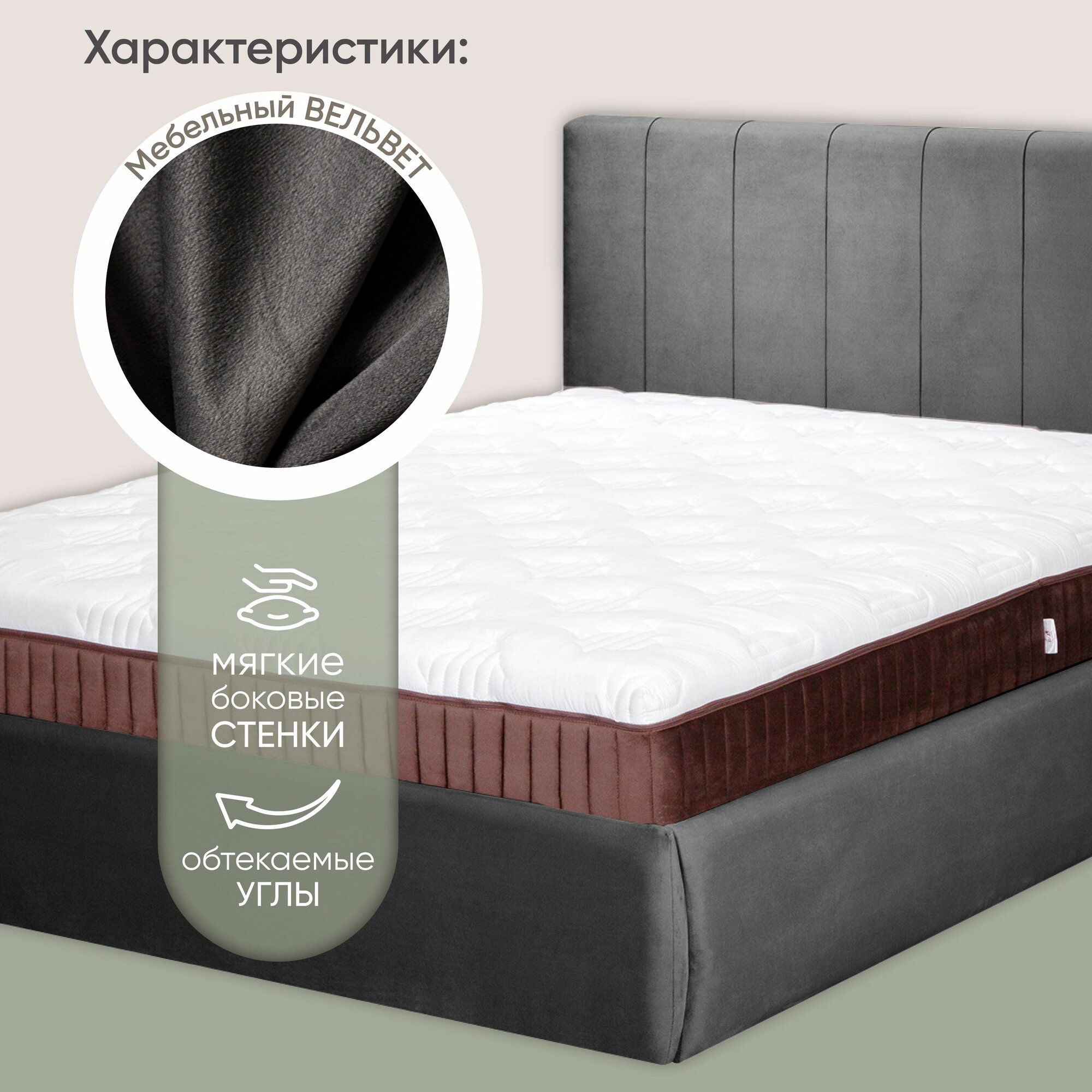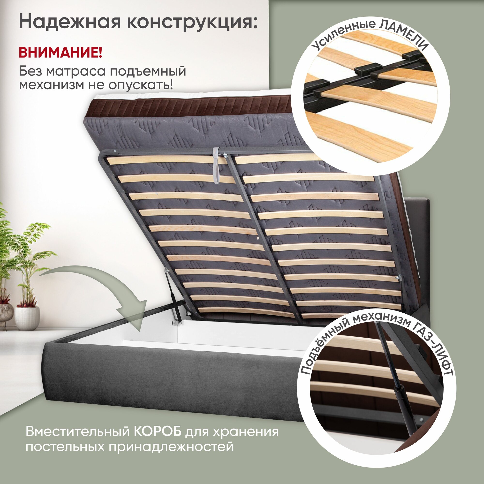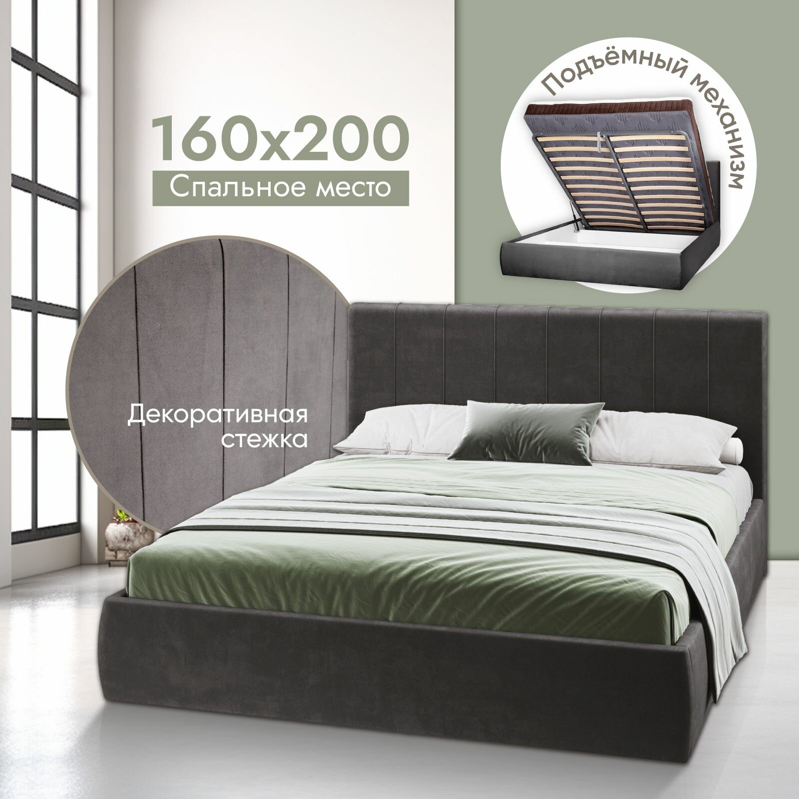 Двуспальная кровать 160х200 с подъемным механизмом, Монако с мягким изголовьем для дома, для спальни, ортопедическое основание, ламели усиленные, ящик для белья, вельвет темно-серый, Ами Мебель, Беларусь информация: