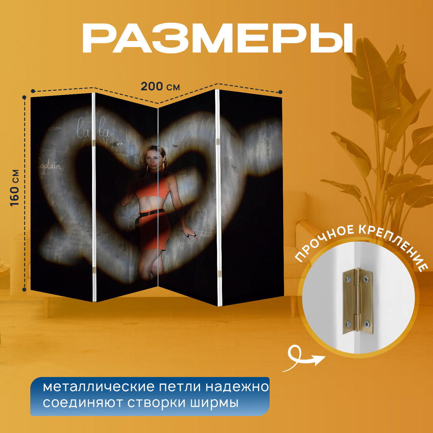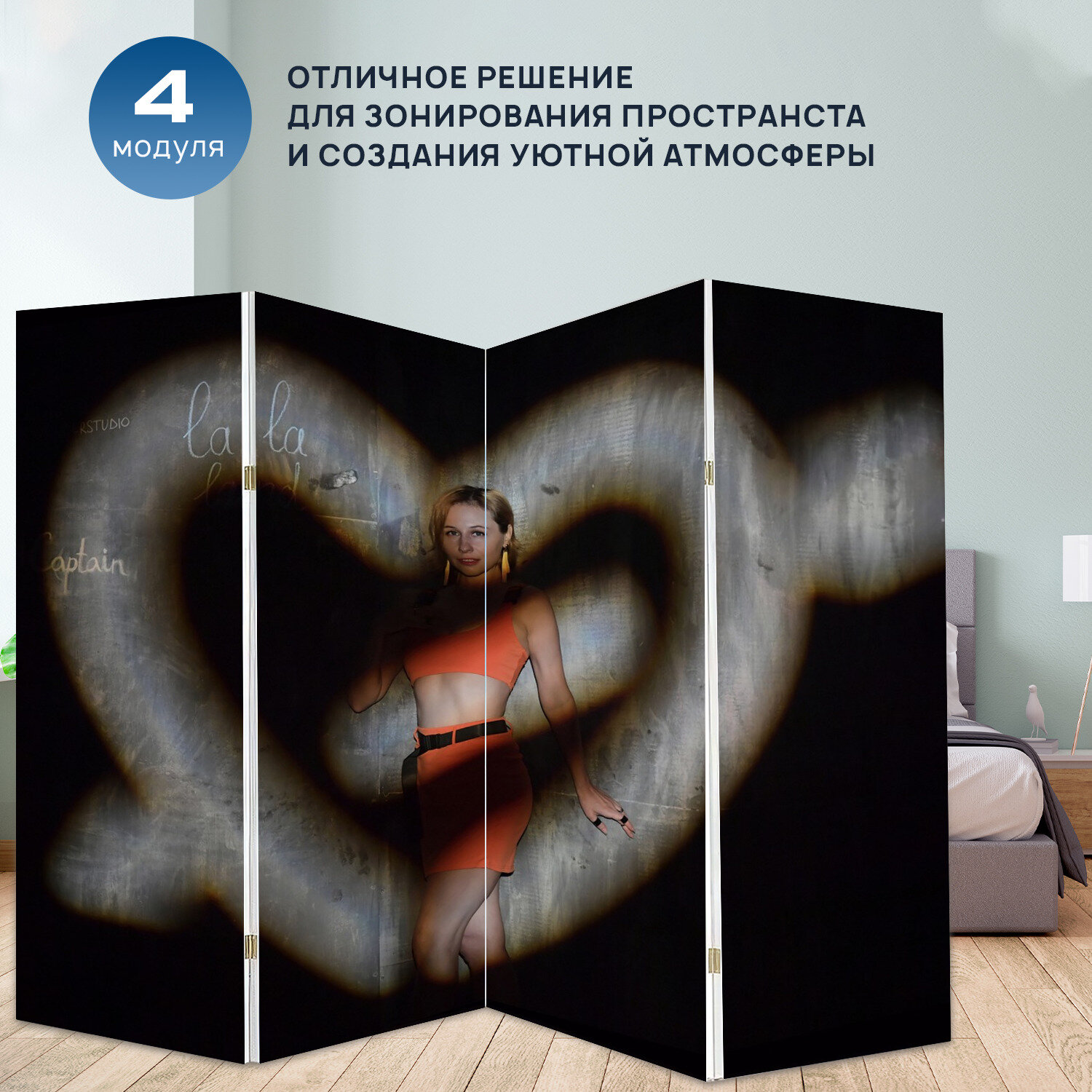 Ширма "Сердце, свет, проектор" раскладная перегородка для зонирования с принтом на холсте информация:
